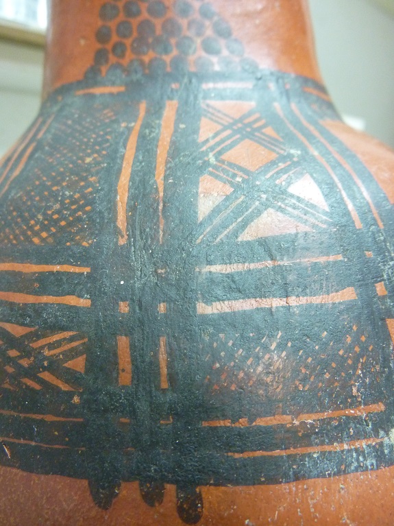 Le décor peint à même la terre est recouvert d’une concrétion qu’il faudra traiter puis nettoyer au badigeon.